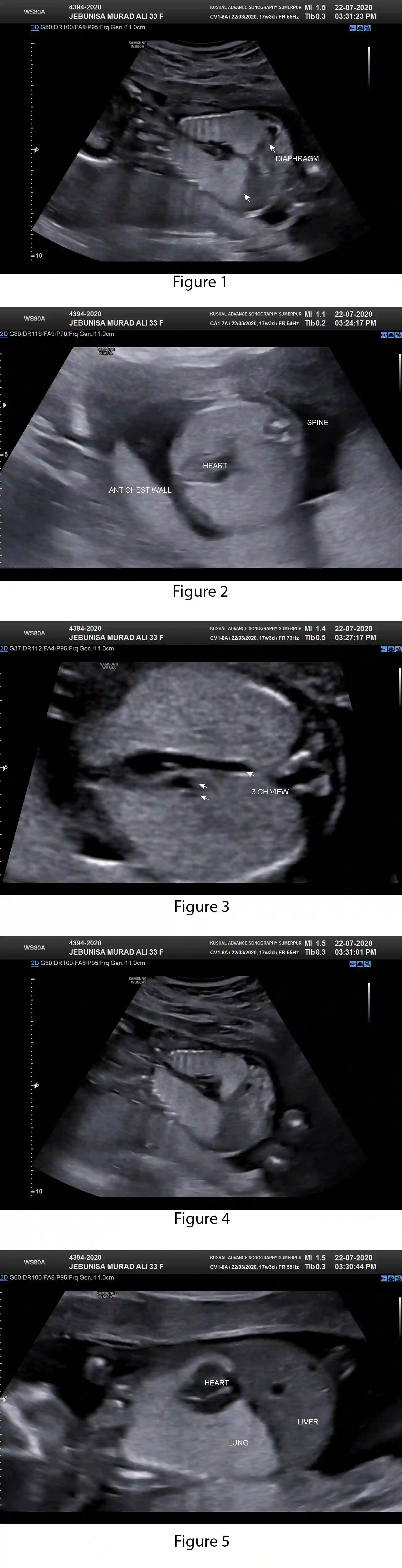 Ultrasound features become evident ≥16 weeks’ gestation. The lungs are massively enlarged and hyperechogenic resulting in compression of the heart and development of ascites. The bronchial tree is dilated and the diaphragm inverted.