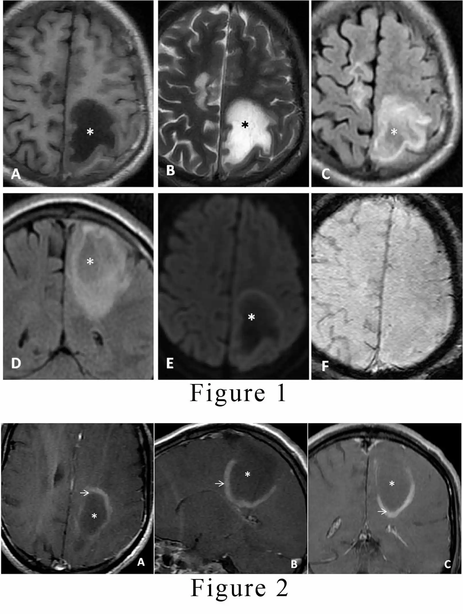 Figure 1. Unenhanced magnetic resonance imaging (MRI) brain (A, B, C, and D) axial T1 weighted imaging (T1WI), T2WI, Fluid attenuation inversion recovery sequences (FLAIR), and coronal plane FLAIR respectively; demonstrate an irregular abnormal signal intensity lesion with perilesional edema (asterisk) following fluid signals involving left high parietal region predominantly involving white matter. Figure 1 (A, B, and C) axial images shows similar lesionin right fronto-parietal region. (E and F, axial planes) The lesion in left parietal region does not demonstrate diffusion restriction or blooming on diffusion-weighted imaging (DWI) and susceptibility-weighted imaging (SWI) respectively.